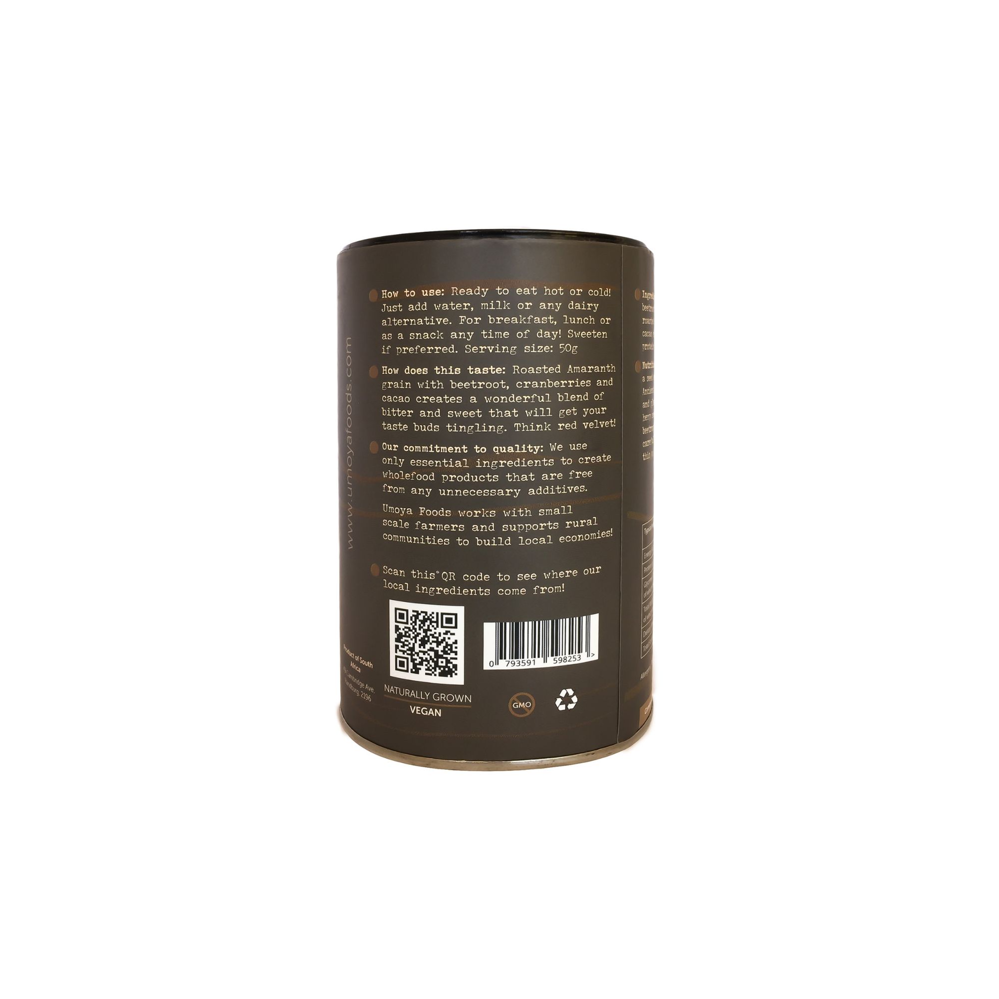 Our range of Thrive Cereals is a celebration of local ancient grains. Each variant is an expertly crafted base of amaranth and sorghum with natural superfood additions like cacao and baobab powder. This instant cereal can be eaten with hot or cold milk, as a shake or sprinkled over yoghurt and fruit. They are as delicious as they are nutritious and versatile. Cacao for the chocolate lovers! All three variants are